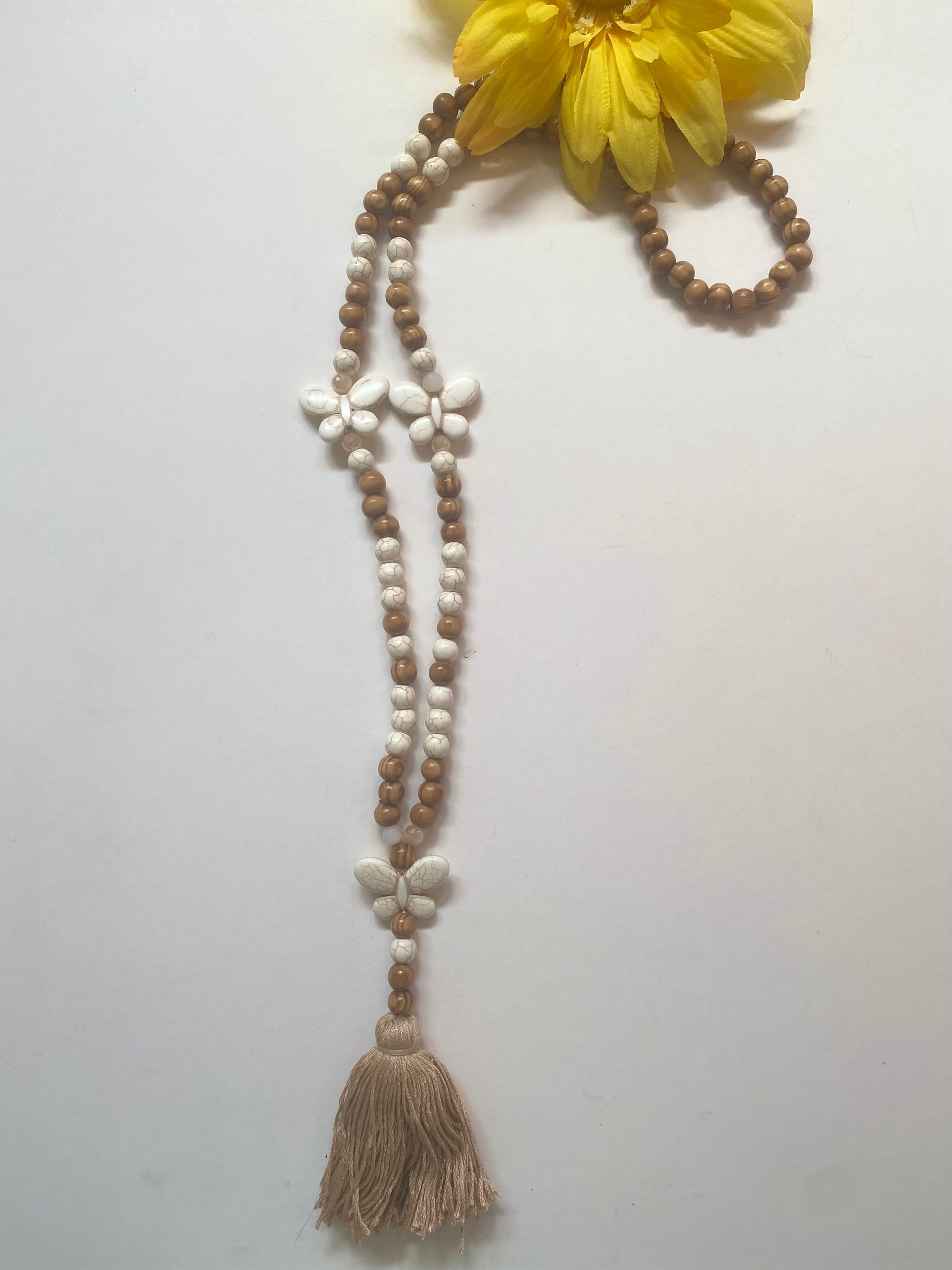 beads en nadera brown/beige, charm de corazon o mariposa, largo:48"